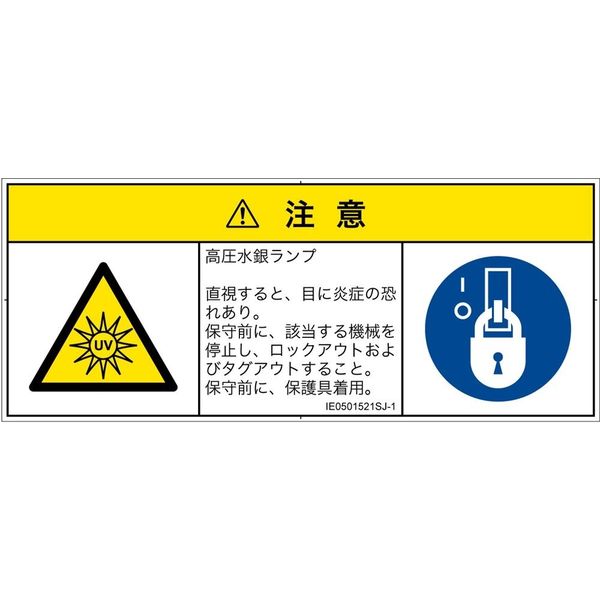 | 商品の特徴 | ●高圧水銀ランプ●直視すると、目に炎症の恐れあり。●保守前に、該当する機械を停止し、ロックアウトおよびタグアウトすること。●保守前に、保護具着用。 | ||