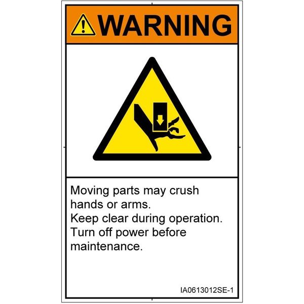 | 商品の特徴 | ●Moving parts may crush hands or arms.●Keep clear during operation.●Turn off power before maintenance. | ||