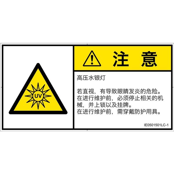 | 商品の特徴 | ●高圧水銀ランプ●直視すると、目に炎症の恐れあり。●保守前に、該当する機械を停止し、ロックアウトおよびタグアウトすること。●保守前に、保護具着用。 | ||