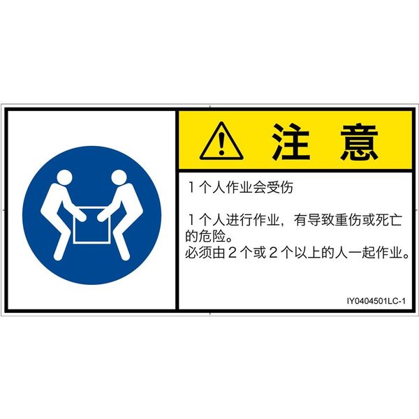 PL警告表示ラベル(ISO準拠)│指示事項:二人作業│IY0404501│注意│Lサイズ│簡体字(ヨコ)│6枚 IY0404501LC-1(直送品)