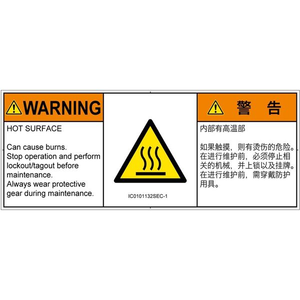 | 商品の特徴 | ●HOT SURFACE●Can cause burns.●Stop operation and perform lockout/tagout before maintenance.●Always wear protective gear during maintenance. | ||