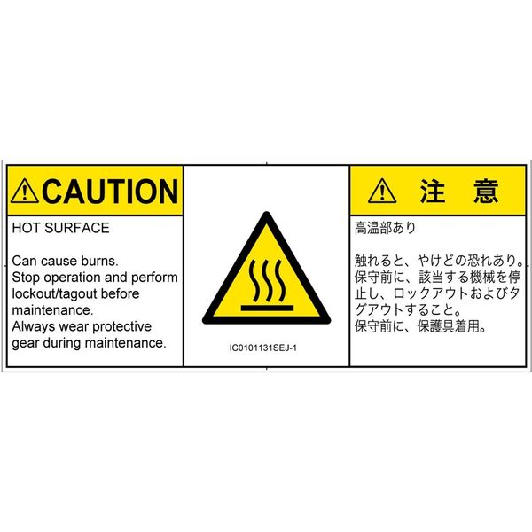 | 商品の特徴 | ●高温部あり●触れると、やけどの恐れあり。●保守前に、該当する機械を停止し、ロックアウトおよびタグアウトすること。●保守前に、保護具着用。●HOT SURFACE●Can cause burns.●Stop operation and perform lockout/tagout before maintenance.●Always wear protective gear during maintenance. | ||