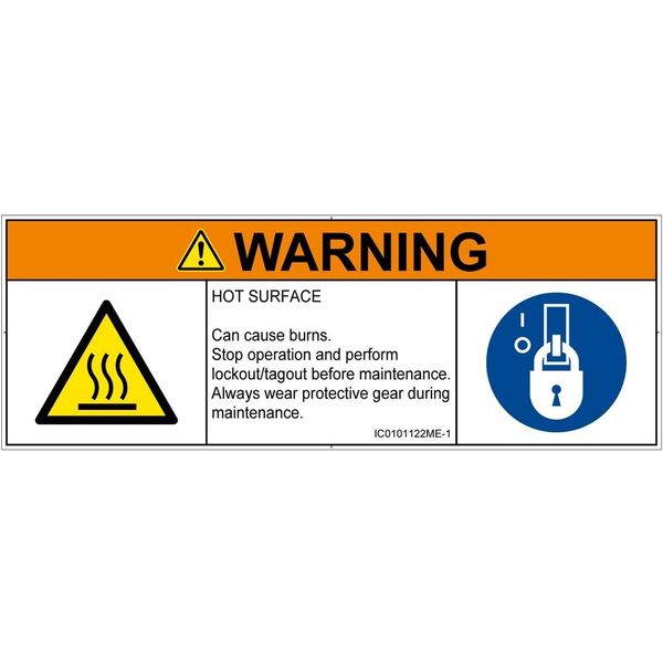 | 商品の特徴 | ●HOT SURFACE●Can cause burns.●Stop operation and perform lockout/tagout before maintenance.●Always wear protective gear during maintenance. | ||