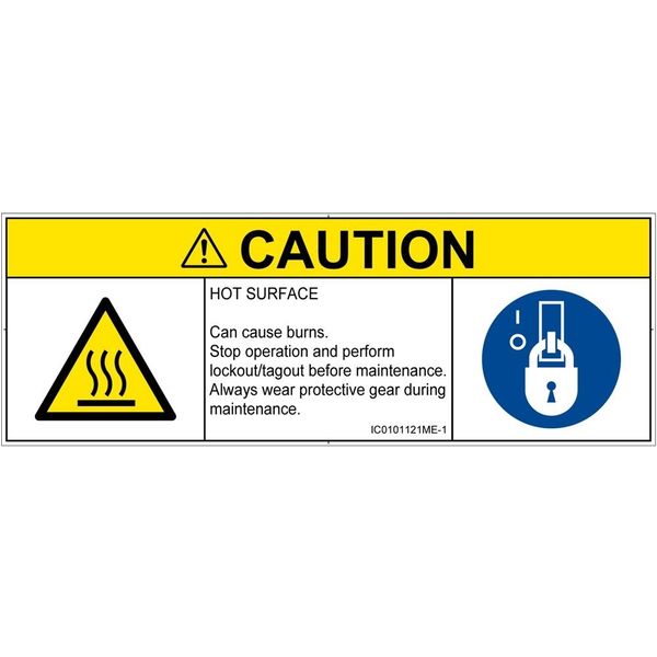 | 商品の特徴 | ●HOT SURFACE●Can cause burns.●Stop operation and perform lockout/tagout before maintenance.●Always wear protective gear during maintenance. | ||