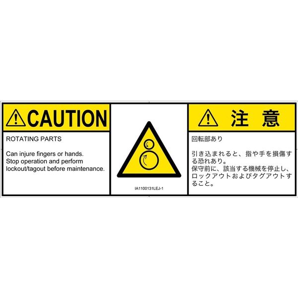 | 商品の特徴 | ●回転部あり●引き込まれると、指や手を損傷する恐れあり。●保守前に、該当する機械を停止し、ロックアウトおよびタグアウトすること。●ROTATING PARTS●Can injure fingers or hands.●Stop operation and perform lockout/tagout before maintenance. | ||