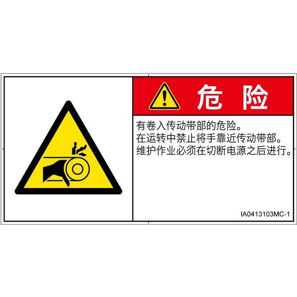 | シンボルマーク準拠規格 | メーカーオリジナル(ANSI Z535.3-2011準拠) | 危険の種類 | 機械的な危険 引き込み(ベルト) |