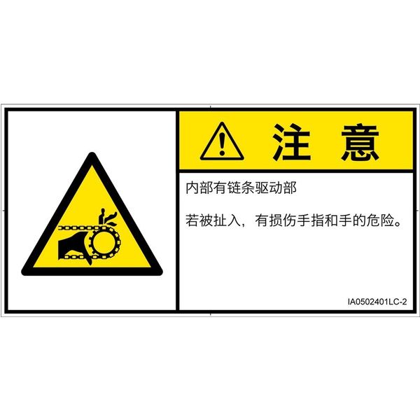 | 危険の種類 | 機械的な危険 引き込み(チェーン) | フォーマット準拠規格 | ISO 3864-2:2016、ISO 3864-1:2011 |