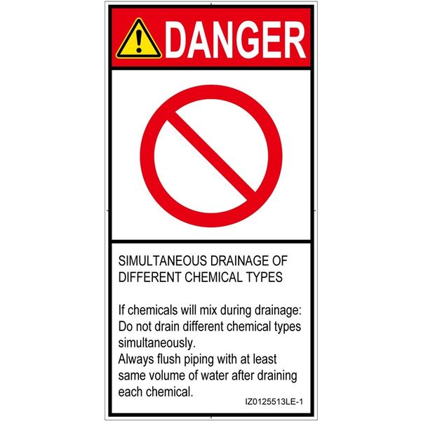 | 商品の特徴 | ●SIMULTANEOUS DRAINAGE OF DIFFERENT CHEMICAL TYPES●If chemicals will mix during drainage:●Do not drain different chemical types simultaneously.●Always flush piping with at least same volume of water after draining each chemical. | ||