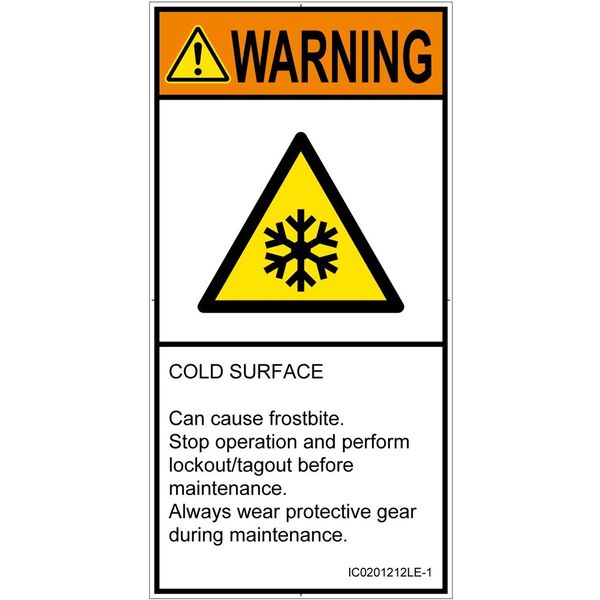 | 商品の特徴 | ●COLD SURFACE●Can cause frostbite.●Stop operation and perform lockout/tagout before maintenance.●Always wear protective gear during maintenance. | ||