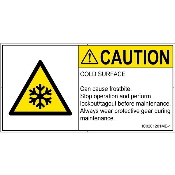 | 商品の特徴 | ●COLD SURFACE●Can cause frostbite.●Stop operation and perform lockout/tagout before maintenance.●Always wear protective gear during maintenance. | ||