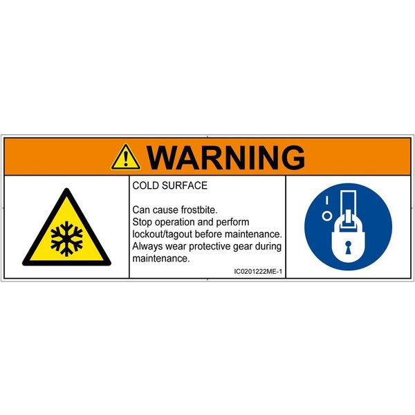| 商品の特徴 | ●COLD SURFACE●Can cause frostbite.●Stop operation and perform lockout/tagout before maintenance.●Always wear protective gear during maintenance. | ||