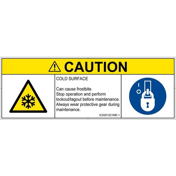 | 商品の特徴 | ●COLD SURFACE●Can cause frostbite.●Stop operation and perform lockout/tagout before maintenance.●Always wear protective gear during maintenance. | ||