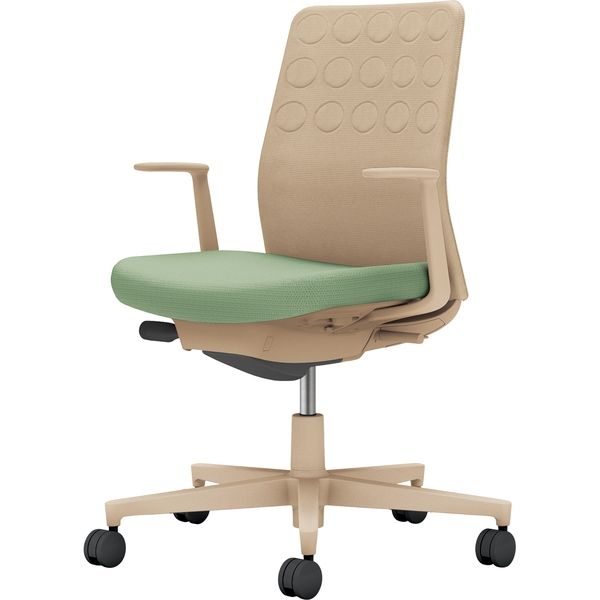| 材質 | ●材質/背:(背板)強化ナイロン(張り地)ポリエステル(クッション)スラブウレタン●材質/座:(座板)PP(張り地)ポリエステル(クッション)モールドウレタン●材質/肘:強化ナイロン●材質/脚:強化ナイロン、キャスター:ポリウレタン巻き(φ60mm) | カラー | ソフトベージュ×パウダーミント |