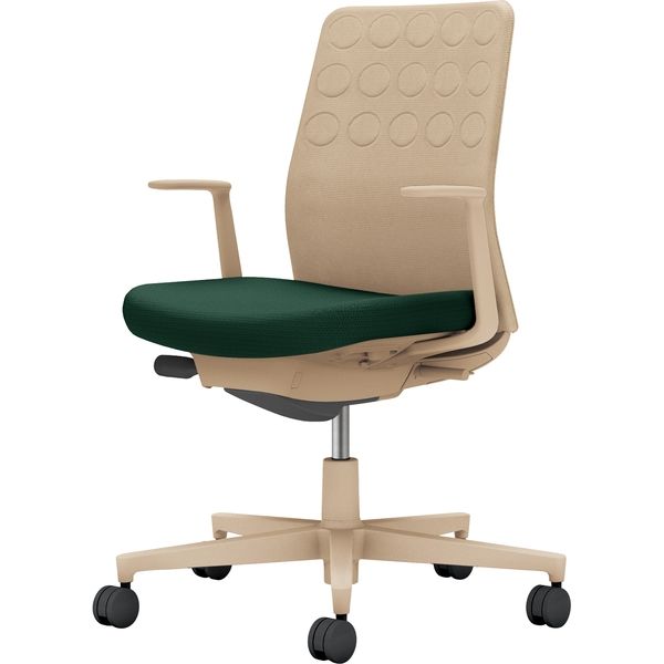 | 材質 | ●材質/背:(背板)強化ナイロン(張り地)ポリエステル(クッション)スラブウレタン●材質/座:(座板)PP(張り地)ポリエステル(クッション)モールドウレタン●材質/肘:強化ナイロン●材質/脚:強化ナイロン、キャスター:ポリウレタン巻き(φ60mm) | カラー | ソフトベージュ×ディープグリーン |