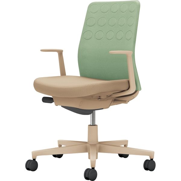 材質 ●材質/背:(背板)強化ナイロン(張り地)ポリエステル(クッション)スラブウレタン●材質/座:(座板)PP(張り地)ポリエステル(クッション)モールドウレタン●材質/肘:強化ナイロン●材質/脚:強化ナイロン、キャスター:ナイロン(φ60mm) カラー パウダーミント×ソフトベージュ