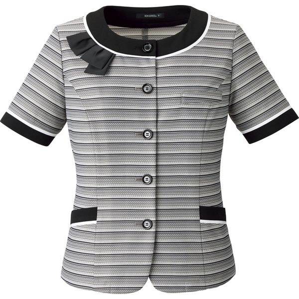《ノーカラー_七分袖ソフトジャケット》通気性が高く蒸れにくくニットで快適な着心地。作業しやすい七分袖、顔廻りをスッキリ魅せる。挟み込みリボン付[5つ釦]