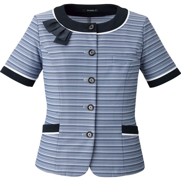 《ノーカラー_七分袖ソフトジャケット》通気性が高く蒸れにくくニットで快適な着心地。作業しやすい七分袖、顔廻りをスッキリ魅せる。挟み込みリボン付[5つ釦]