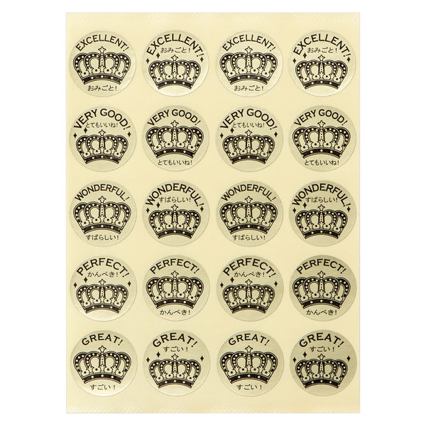 | 商品の特徴 | 「王冠」のイラストと、励ましの言葉が英語(英文)と日本語で書いてあるシール。はげましの言葉は「おみごと・とてもいいね・すばらしい・かんぺき・すごい」の5種類●学校、幼稚園、保育園、塾、おけいこ、ご家庭や教育など色々な場面で使えるかわいいシール●「トイレトレーニング(トイトレ)」「はみがき」「宿題」「片付け」「着替え」等の生活習慣へのごほうびシールとしても大活躍。目標の達成や、がんばったご褒美、はげましのシール貼りに!●分類や見出し表示、グラフ作成、手帳やノートのデコレーション等幅広い用途にも便利 | ||