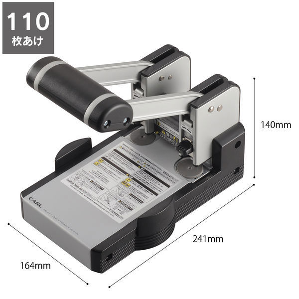 | 商品の特徴 | ぴったりと手に馴染むハンドルは力が掛けやすく110枚穴あけもスムーズに行えます。穴あけ位置は幅広なダブルゲージに用紙を挟み込めば簡単に中央合わせが可能なので効率よく作業が行えます(紙幅137~300mmに対応)。大量枚数の穴あけを主とする強力パンチとしてはコンパクトな形状なので僅かなスペースで活用いただけます。透明クズ受けは抜きカスがひと目でわかり本体から取り外せるのでクズ捨てが簡単です。刃の交換はネジをひねると取り外せるので交換には工具などを必要としません。 | ||