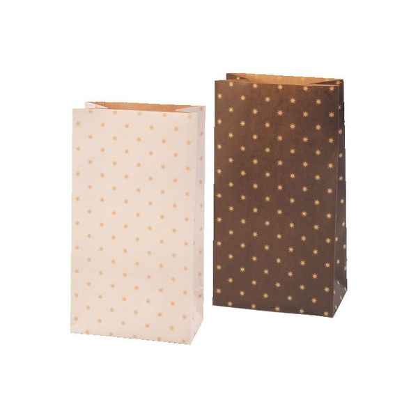 | 商品の特徴 | ちょっとした贈り物におすすめな、底マチ付きの紙袋です。マチがしっかり付いているので、厚みがあるお品物も入れられます。包むの人気の星柄、ステラがデザインされています。シンプルなデザインなので、小さなお子様から大人の方までお使いいただけます。ホワイトとブラウンの2色入で贈る相手に合わせてお楽しみいただけます。 | ||