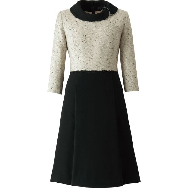 | 商品の特徴 | 優しい印象のネックラインとソフトプリーツの裾が大人可愛いワンピース。襟とウエストにあしらったシルバーのパイピングが華やかさをアップ。着心地も快適なふんわりした裾のデザインがフェミニンな印象を演出します。 | ||