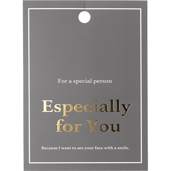 | 商品の特徴 | 「Especially for You」のメッセージが入ったギフトタグです。シックなダークグレーに金箔押しのメッセージが入ったスマートなデザインでギフトを豪華に演出します。穴部分に切り込みが入っており、袋や箱にかけたリボンに引っ掛けるだけで簡単にお使いいただけます。 | ||