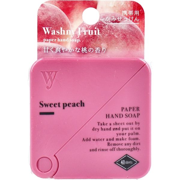 - いつでもどこでも手洗い習慣!フルーツの優しい香りでリフレッシュしながらさっと手洗いができます。●困ったときのMYせっけん:公共の場で共用のハンドソープを使うのが気になる方にもオススメです。●持ち運び便利:5cm四方、厚さ1.4cmと、胸ポケットに入れておけるほどスリムなサイズでかさばりません。●自慢したくなる、スタイリッシュなデザイン:まるでミントタブレットのようなスタイリッシュなハードケースと、カラフルなカラーで洗練されたデザインが特徴です。●たっぷり使える40シート入り:コンパクトなのに、中にはたっぷり40シートもあるので気軽に使えます。●ふわっと香る、フルーツの香り:洗っている間はもちろん、水で洗い流した後にもふわっと香る自慢の香りです。●スウィートピーチ:甘く爽やかな桃の香り。