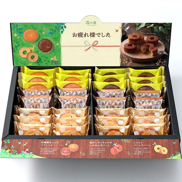 | 商品の特徴 | 「お疲れ様でした」の言葉とともに休憩室などに置いて、社員のみんなでご賞味いただける人気のギフトです。日常の喧騒を離れ、自分だけの癒しの世界でゆっくりとスイーツを楽しむ空間づくりをギフトに込めたブランド「森の庭」より、18種類のお菓子を詰め合わせました。しっとりふんわりバームクーヘンや、焦がしキャラメルがしみ込んだバーム、有精卵をふんだんに使ったマドレーヌのプレーンとショコラと、素朴で素材の味わいを楽しめるお菓子たちです | ||