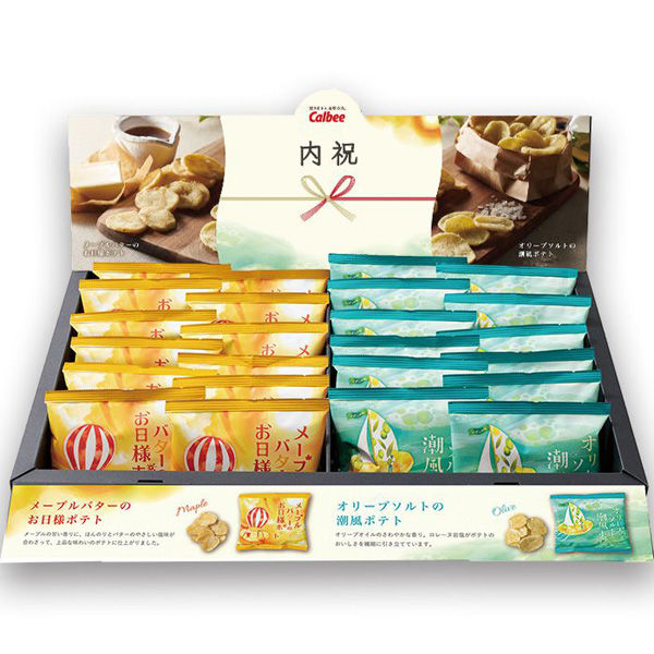 | 商品の特徴 | 「内祝」の言葉とともに休憩室などに置いて、社員のみんなでご賞味いただける人気のギフトです。「メープルバターのお日様ポテト」はメープルの甘い香りに、ほんのりとバターのやさしい塩味が合わさって、上品な味わいのポテトに仕上がりました。「オリーブソルトの潮風ポテト」はオリーブオイルの爽やかな香り。ロレーヌ岩塩がポテトの美味しさを繊細に引き立てています。※フランス産ロレーヌ岩塩100%使用(食塩中) | ||