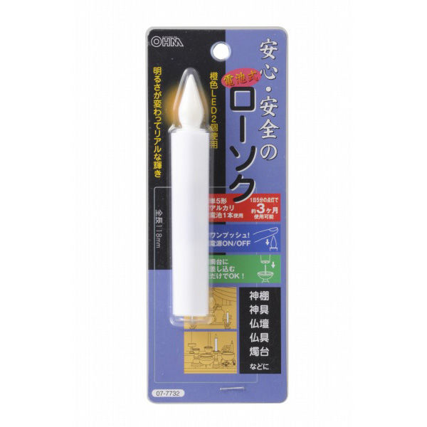 | 商品の特徴 | ● 神棚や仏壇などに使う装飾用のローソク型LEDライトです。● 火を使わないので、安心安全です。● 橙色(オレンジ色)LEDを2個使用。● ワンプッシュで電源ON/OFF。● 本体底部に穴が空いているので燭台に差し込めます。 | ||