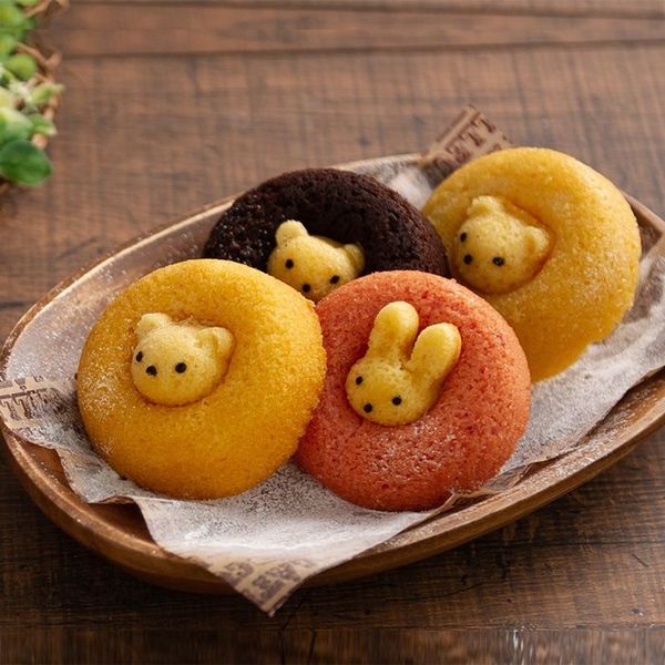 イチゴ味のドーナツの真ん中から小さな森のうさぎがこんにちは。
