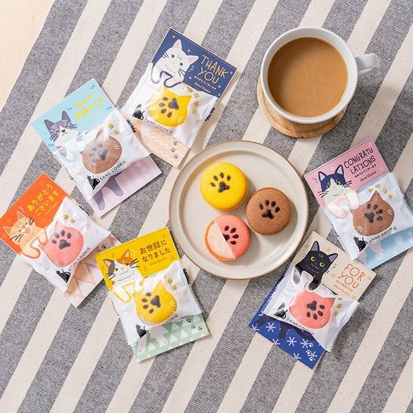 | 商品の特徴 | 猫の足跡が可愛らしい、クリームがサンドされたクッキー。かわいらしいクッキーと一緒に猫たちがあなたのメッセージをお届けします。イベント、展示会の販促品、ノベルティ、景品、プチギフトなど幅広くご利用いただけます。 | ||