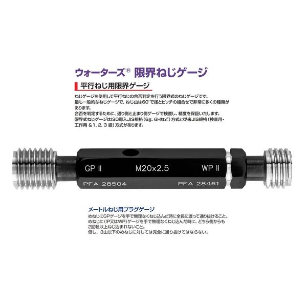 | 商品の特徴 | ●メートルねじ用プラグゲージ●従来JIS規格(JIS B0251&B0252付属書)メートルねじ(=旧JIS) | ||