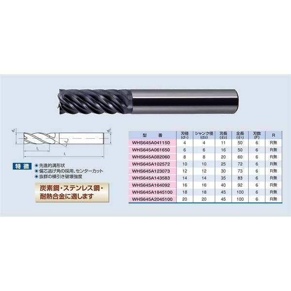 | 商品の特徴 | ●6枚刃スクウェアエンドミル●強ネジレ●AlTiNコーティング | ||