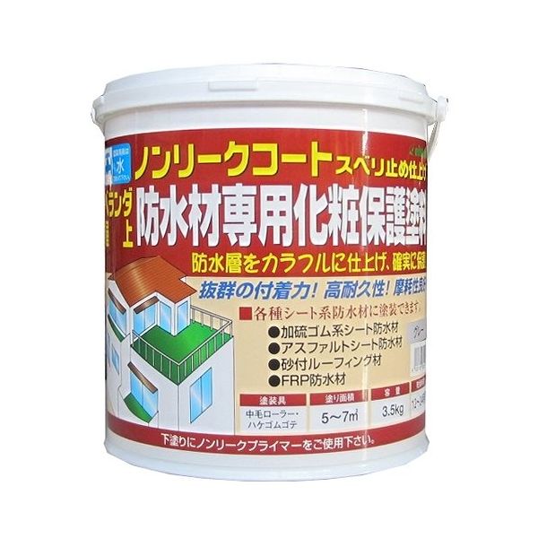 | 商品仕様1 | ●【特長】・各種シート系防水材のトップコート塗り替えに(骨材入り滑り止め仕上げ)【用途】・加硫ゴム系シート防水材、アスファルトシート防水、砂付ルーフィング材、FRP屋上防水に。【サイズ/塗り面積】・3.5kg / 5~7m2・ 10kg / 15~20m2【成分】・スチレン酢ビエマルション【うすめ液/用具の手入れ】・通常不要 / 水【乾燥時間】・12~24時間以上(気温20度時)【注意事項】・降雨・降雪・気温5度以下の時は塗装を避けてください。・防水シートの剥がれ・膨れ・劣化がある場合は塗装しないでください。(防水シートを補修する必要があります。)・既に水漏れや雨漏りが始まっている場所には使用できません。 | ||