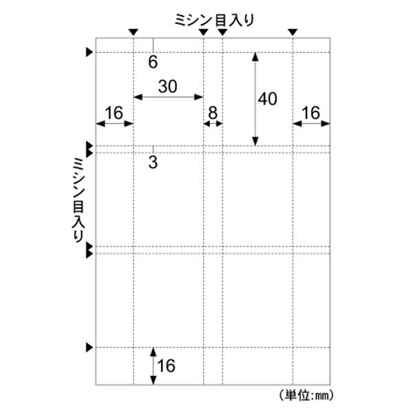 - ●サイズ:ハガキ100×148mm●紙厚:0.23mm●ミシン目切り離し後のサイズ:30×40mm●坪量:188g/m2程度●面付け:6(2×3)●表面:光沢(つやあり)●裏面:マット(つやなし)
