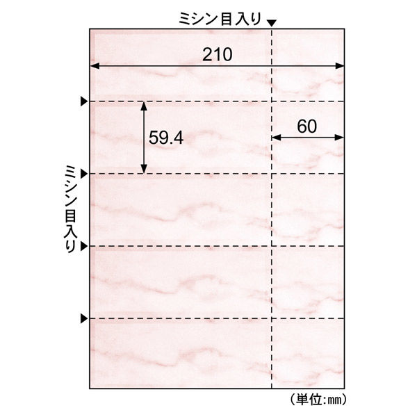 | カラー | ローズ | 商品仕様 | ●サイズ:A4210×297mm●紙厚:0.10mm●ミシン目切り離し後のサイズ:210×59.4mm(半券60×59.4mm)●坪量:81.4g/m2程度●面付け:5 |