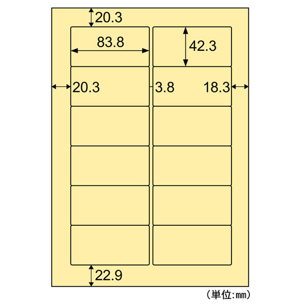 | 坪量 | 191g/m2程度 | 商品仕様 | ●サイズ:A4210×297mm●紙厚:0.22mm●ラベルサイズ:83.8×42.3mm●坪量:191g/m2程度●面付け:12(2×6)●素材:色上質紙 |