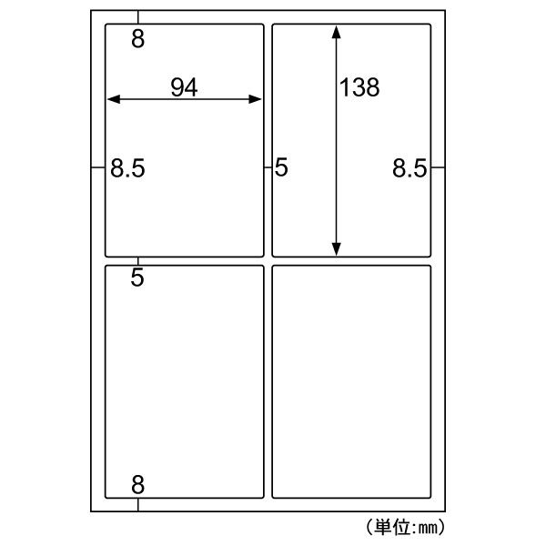 坪量 127g/m2程度 商品仕様 ●サイズ:A4210×297mm●紙厚:0.14mm●ラベルサイズ:94×138mm●坪量:127g/m2程度●面付け:4●ラベルのみの厚さ:0.09mm