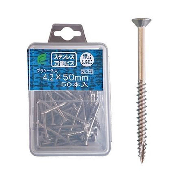 | 商品の特徴 | 強度に優れた太軸のステンレスSUS410を採用。堅い材料にスムーズにネジを切る高い山低い山の2条ネジ。施工性に優れ木割れを防止する先端先割カット付。頭がしっかり沈み止まりの良いフレキ付大頭。使い易い少量パック。硬質デッキ材等にご使用の際は、下穴をあけ皿取をして下さい。 | ||