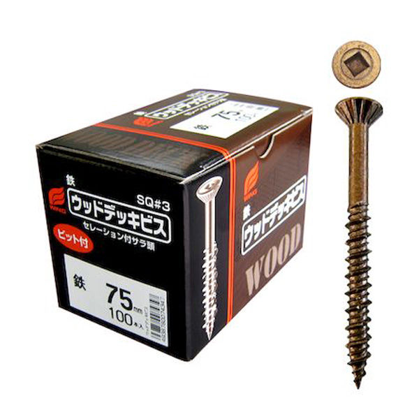 商品の特徴 ケバ立ちがなくシッカリ沈むセレーション付サラ頭。仕上がりが美しいダウンフェイスリセス。超硬木に軽く切れ込むダイヤカット付の高低二条ネジ。トルクをシッカリ伝える四角頭。デッキ材に同調し錆を強力に防ぐブロンズラスパート仕上げ。1箱にSQビット1本付。ウリン等の超硬木には必ずストレートの下穴をあけ皿取りをしてください。