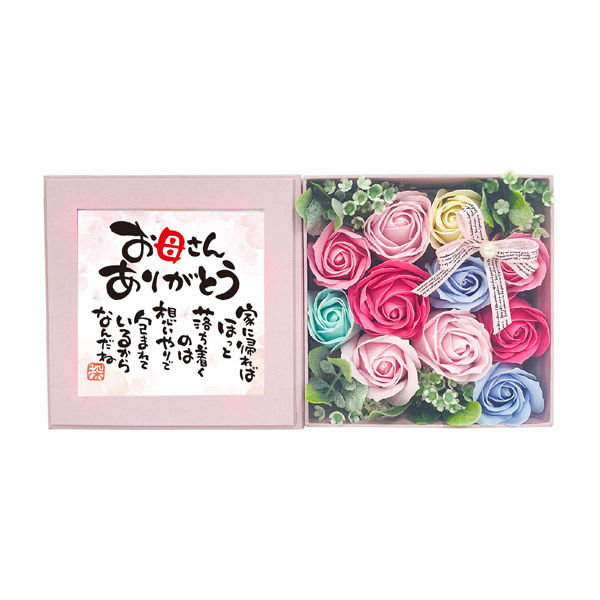 | 商品の特徴 | 「花のカタチの入浴剤」まるで生花のようなディテールのソープフラワーのアレンジ。花びら1枚1枚がバスペタル。書画家による味わいのある想いのこもったポエムが大好評の商品。ポエム部分はフォトフレームになっているのでお好きな写真に入れ替えて飾ることもできます。 | ||