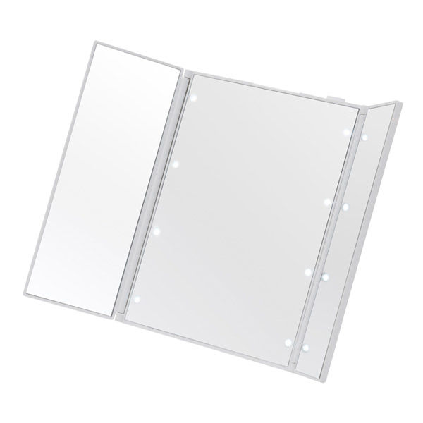 | 商品の特徴 | ●お顔を明るく照らす折り立て式コンパクト三面鏡●角度調節も自由自在●飛散防止加工●電池式(動作確認用電池入り CR2032電池×2個) | ||