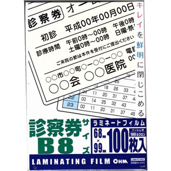 オーム電機 ラミネートフィルム100ミクロン 診察券 LAM-FS1003 1パック(100枚)