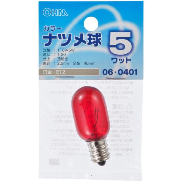 | その他1 | 【 特 長 】● 口金E12、5Wのカラーなつめ球● 常夜灯にもお使いいただけます。● 白熱球のやさしい明り【 仕 様 】■ 定格:110V-5W■ 口金:E12■ 形状:T-20■ 仕上:透明赤■ サイズ:直径20mm、全高48mm | ブランド | オーム電機(OHM) |