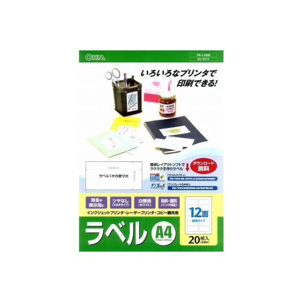オーム電機 マルチラベル A4(12面)×20枚 PA-L1220 1個