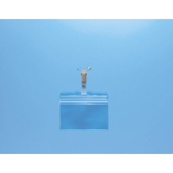 カードの脱落を防ぐチャック付きのソフトタイプの横型名札です。吊下げ式樹脂クリップ・ピン付きです。