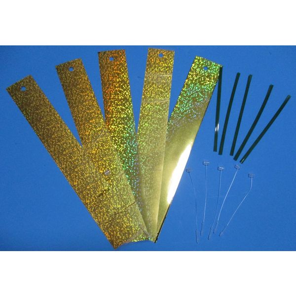 反射ホログラムによる反射と風力による短冊の揺れの恐怖で鳥よけ効果を発揮する。5箇所に設置できるセット。