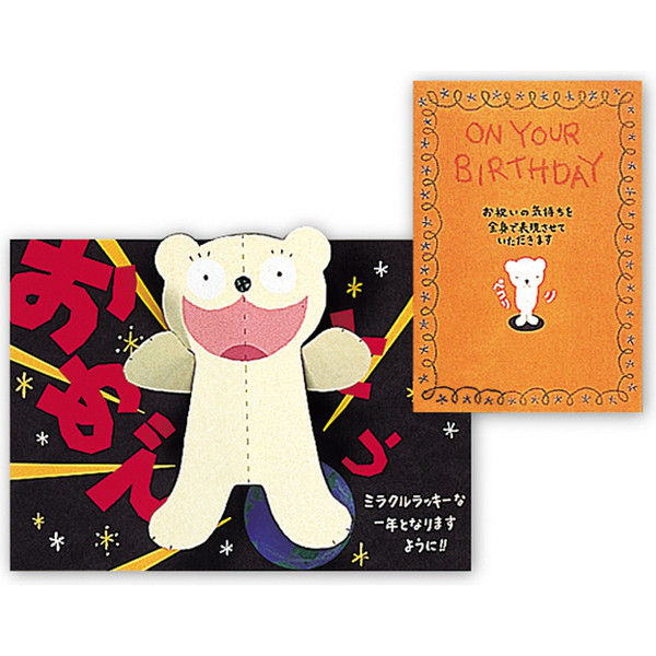 | 商品の特徴 | 誕生祝い立体カード/表:お祝いの気持ちを全身で表現させていただきます中:おめでとうミラクルラッキーな一年となりますように!! | ||