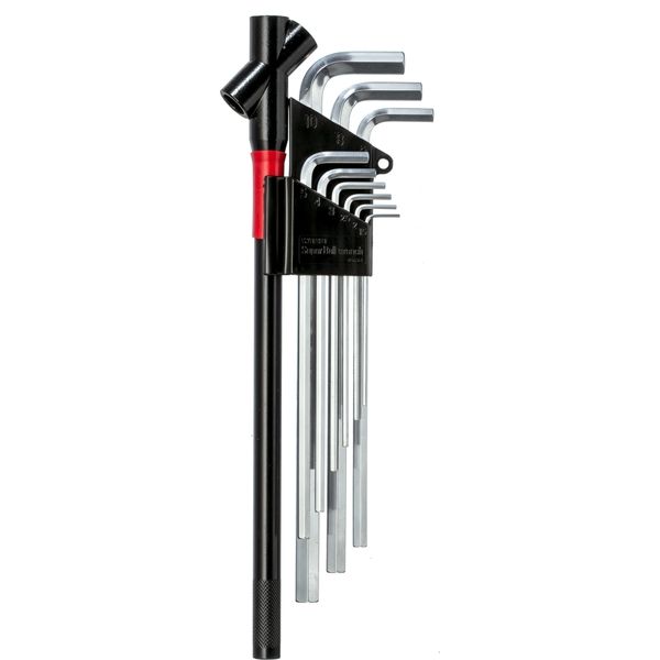 硬質クロームメッキ処理を施した六角棒レンチセットです。本締め、早回しに適した電着塗装ハンドル付きです。